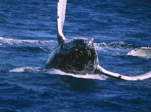 | This unusual picture of a calf breaching towards us is indicative of the spirited play of young whales. The calf was repeatedly head lunging and breaching close to Karma while mother lounged quietly and sedately in the background.